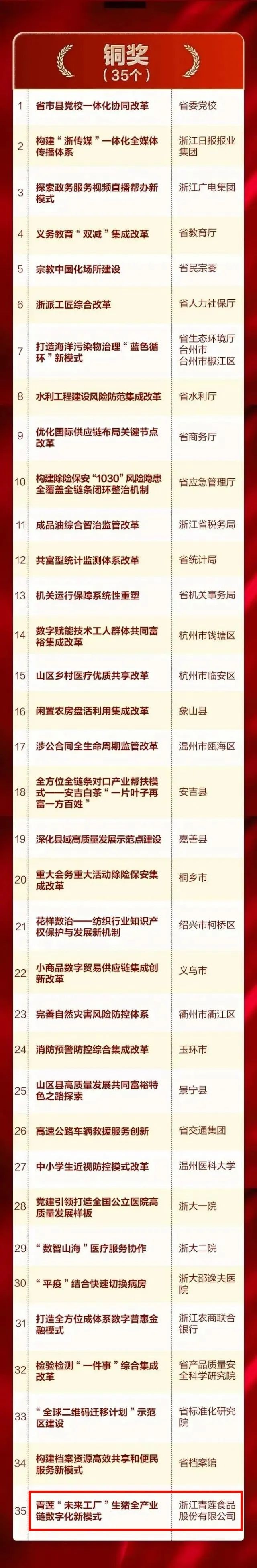 重磅!青蓮食品—膳博士榮獲浙江改革突破獎銅獎! 2023-02-02 08:37:26 浙江青蓮食品股份有限公司 瀏覽次數(shù) 8149 近日,浙江省委改革辦公布了2022年度浙江省改革突破獎名單。浙江青蓮食品股份有限公司“數(shù)智青蓮”未來工廠榮獲2022年度浙江省改革突破獎銅獎,是銅獎組中唯一的一家民營企業(yè)。20多年來,青蓮食品構(gòu)建起從農(nóng)場到餐桌的透明全產(chǎn)業(yè)鏈,在改革創(chuàng)新中以種業(yè)為源頭,建立起未來農(nóng)場—未來工廠—產(chǎn)業(yè)新零售等數(shù)字化應(yīng)用,真正從用戶需求出發(fā)為社會提供優(yōu)質(zhì)食品!此次獲得浙江改革突破獎銅獎,更是對青蓮食品數(shù)字化轉(zhuǎn)型成果的肯定和勉勵!實現(xiàn)黑豬專家膳博士在安全和美味雙升級上硬核突破!身為黑豬專家,膳博士服務(wù)過世博會、世乒賽、國際馬拉松比賽,連續(xù)8年為世界互聯(lián)網(wǎng)大會供肉,連續(xù)14年為中國極地研究中心供肉,成為杭州亞運會官方生鮮肉類產(chǎn)品供應(yīng)商。以國家級嘉興黑豬和兩頭烏保種場作為種業(yè)基礎(chǔ)繁育國家級優(yōu)質(zhì)新品種,形成完整的黑豬商品體系為消費者帶來舌尖體驗。近年來,通過智慧養(yǎng)殖為傳統(tǒng)畜牧產(chǎn)業(yè)數(shù)字化轉(zhuǎn)型先行探路,以新一代信息技術(shù)為手段,重塑生豬全產(chǎn)業(yè)鏈生產(chǎn)組織方式和管理服務(wù)模式,構(gòu)建“1+4+N”模型,推動全產(chǎn)業(yè)鏈數(shù)字化轉(zhuǎn)型。產(chǎn)業(yè)零售端以用戶需求為中心持續(xù)推出膳博士黑豬鮮肉鮮制系列產(chǎn)品提升消費體驗,滿足國人對美好生活、品質(zhì)食品的向往。2022年,青蓮智慧牧場首批入選浙江省“未來農(nóng)場”,“數(shù)智青蓮”未來工廠獲全省數(shù)字化改革“最佳應(yīng)用”和全省數(shù)字經(jīng)濟(jì)系統(tǒng)“最佳應(yīng)用”。在全省數(shù)字化改革大會上做匯報演示,列入全省數(shù)字經(jīng)濟(jì)系統(tǒng)地方特色應(yīng)用目錄,受到央視、省級、市縣級等媒體持續(xù)關(guān)注報道。 上一條“風(fēng)云浙商”許明曙:人生把一件事做好就很不容易 下一條全國唯一!膳博士·香雪白豬獲2022年度國家新品種認(rèn)定!